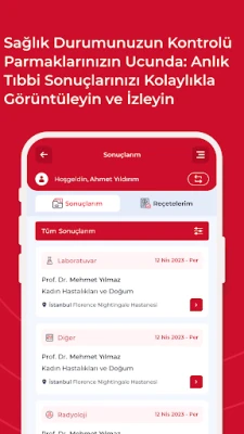 Kusimamia rekodi zako za afya haijawahi kuwa rahisi. Ukiwa na Florence Nightingale Mobil Uygulaması, unaweza kutazama matokeo ya vipimo vyako vya maabara, ripoti za radiolojia, na maagizo ya dawa, yote yakiwa yamekusanywa katika jukwaa moja salama. Programu pia inakuwezesha kufuatilia viashiria muhimu vya afya yako, kama vile idadi ya hatua unazopiga kila siku, urefu, uzito, vikumbusho vya dawa, na taarifa za mzio. Lakini haishii hapo; Florence Nightingale Mobil Uygulaması inakupa uwezo wa kuongeza wapendwa wako—mwenzi, watoto, au wazazi—na kwa ruhusa yao, kufuatilia data zao za afya, na hivyo kuimarisha huduma ya afya kwa familia nzima.