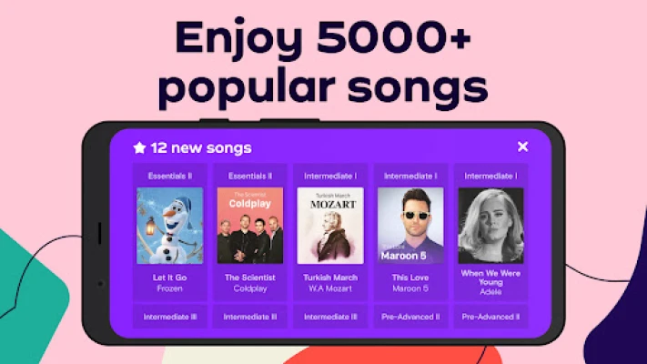 Gundua ulimwengu mpana wa muziki kupitia Simply Piano, ambapo utapata maktaba kubwa yenye zaidi ya nyimbo 5,000 maarufu. Kutoka nyimbo za kitamaduni kama Bach, Beethoven, na Mozart, hadi vibao vya kisasa kama 'Imagine' (John Lennon), 'Chandelier' (Sia), na 'All Of Me' (John Legend), kuna kitu kwa kila ladha. Jifunze hatua kwa hatua, kuanzia kusoma nukuu za muziki, kucheza kwa mikono miwili, kuboresha mbinu yako, hadi kucheza nyimbo unazozipenda. Pokea maoni ya papo hapo juu ya maendeleo yako na uone jinsi unavyopiga hatua kwa wakati halisi, ukifanya mazoezi yako kuwa yenye motisha na tija. Simply Piano inafanya kazi na kibodi au piano yoyote na inafaa kwa rika zote na viwango vyote vya uzoefu. Unda utaratibu wa mazoezi utakao kujivunia, na kwa mazoezi maalum ya Dakika 5, utaona maendeleo ya haraka na mafanikio endelevu. Zaidi ya hayo, inajumuisha akaunti nyingi za familia (hadi tano!) na haina matangazo au viungo vya nje, na kuifanya salama kwa watoto.